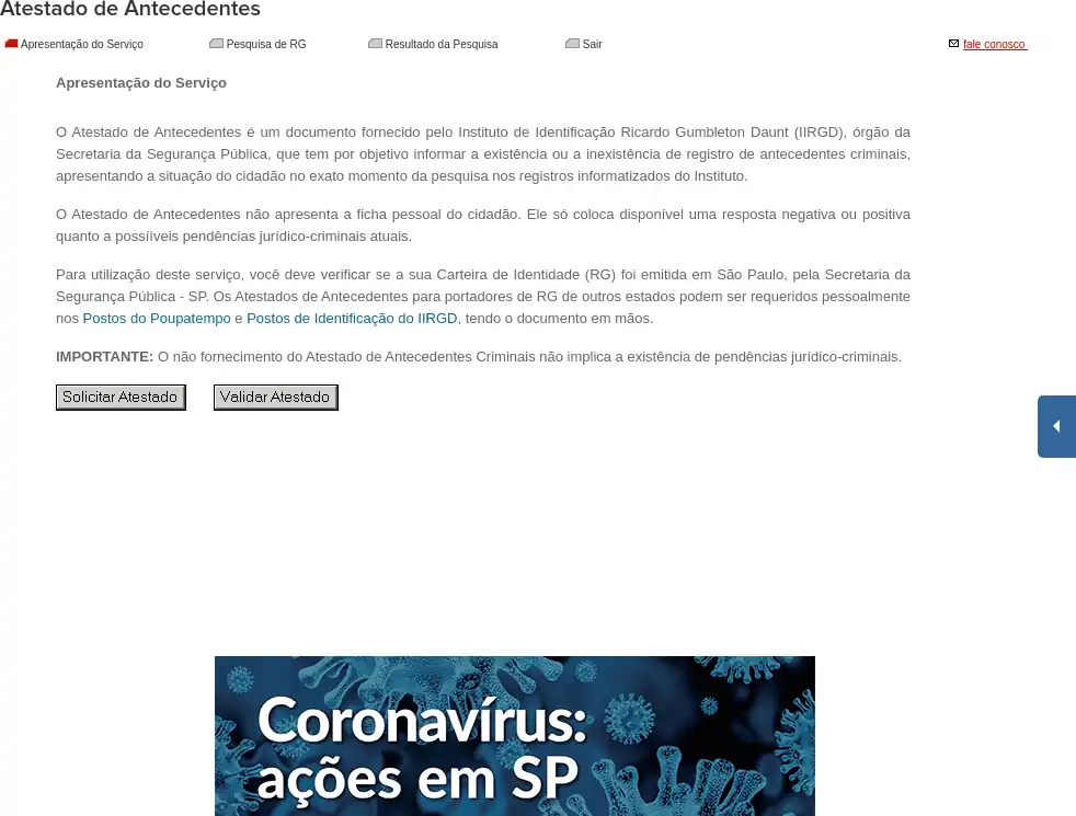 Emite Atestado de Antecedentes no Instituto de Identificação Ricardo Gumbleton Daunt (IIRGD), órgão da Secretaria da Segurança Pública de São Paulo. Este serviço funciona com Carteiras de Identidade (RG) emitidas em São Paulo. IMPORTANTE - O não fornecimento do Atestado de Antecedentes Criminais não implica a existência de pendências jurídico-criminais.