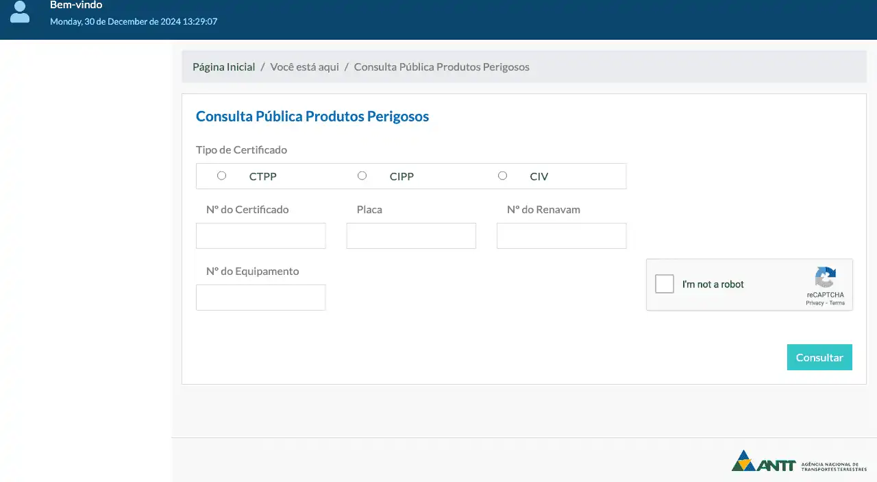 Consulta os dados do veículo transportador e sua situação atual na Consulta Pública de Produtos Perigosos da ANTT (Agência Nacional de Transportes Terrestres).