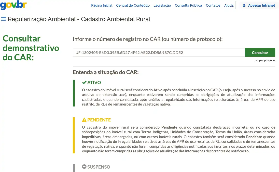 Consulta registro no SICAR (Sistema Nacional de Cadastro Ambiental Rural) a partir do número de registro no CAR.