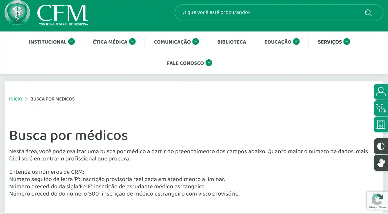 Consulta cadastral de médicos no CFM (Conselho Federal de Medicina).