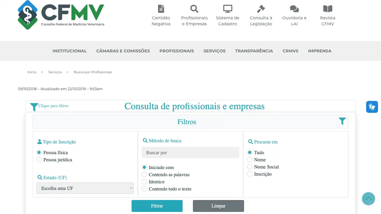 Consulta cadastral de médicos veterinários no CFMV (Conselho Federal de Medicina Veterinária)