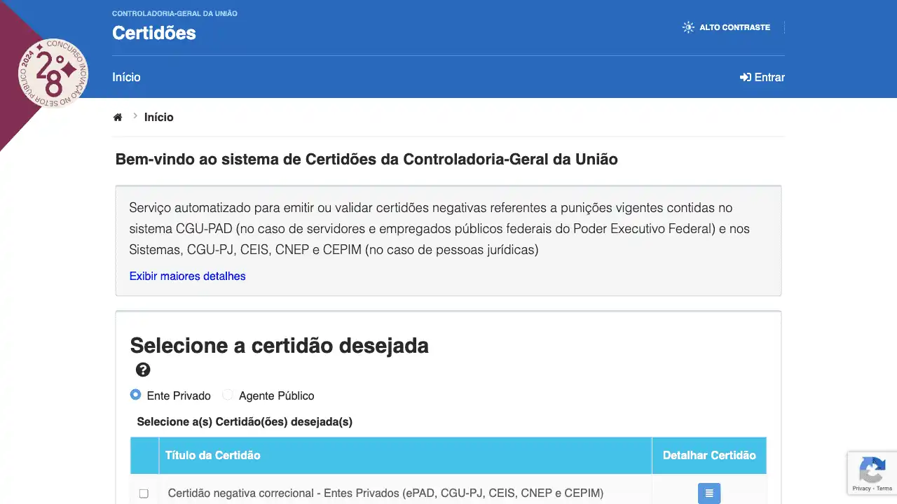 Emite certidão negativa correcional (CGU-PJ, CEIS, CNEP e CEPIM) no âmbito da Controladoria-Geral da União (CGU).