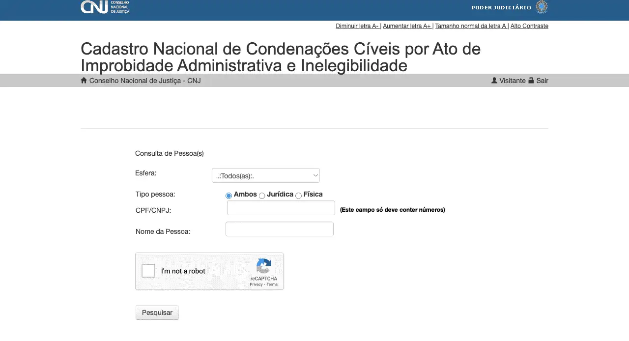 Consulta pessoas físicas e jurídicas no Cadastro Nacional de Condenações Cíveis por Ato de Improbidade Administrativa e Inelegibilidade no portal do Conselho Nacional de Justiça.