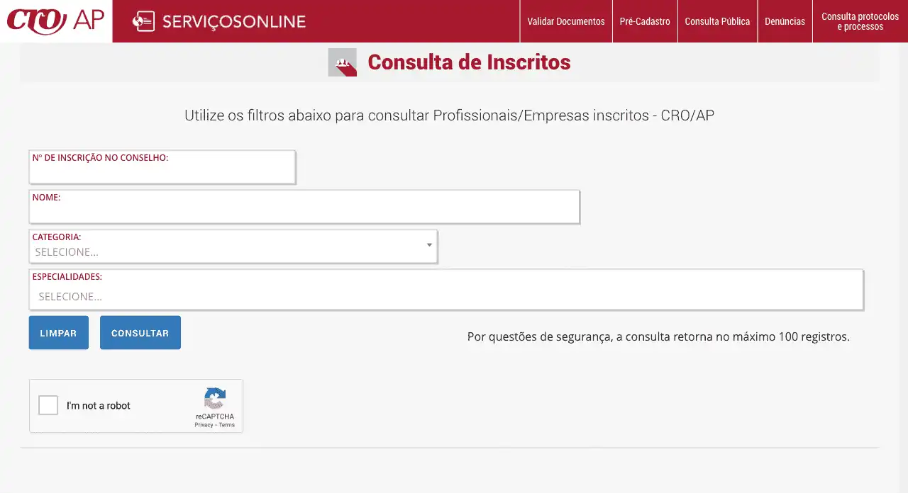 Consulta cadastral de profissionais inscritos no CRO/AP.