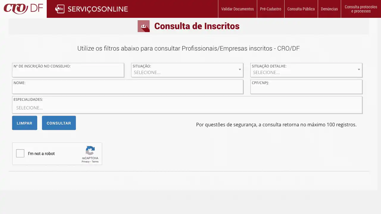 Consulta cadastral de profissionais inscritos no CRO/DF.