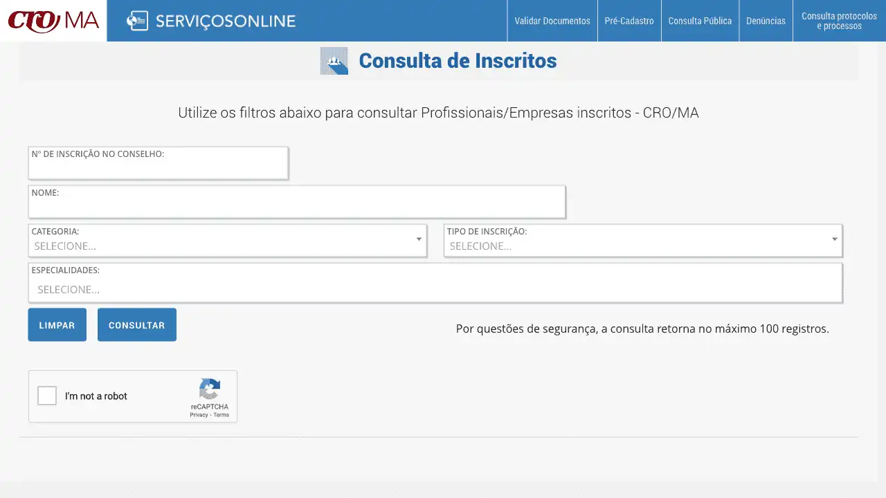 Consulta cadastral de profissionais inscritos no CRO/MA.