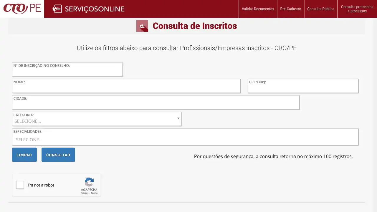 Consulta cadastral de profissionais inscritos no CRO/PE.