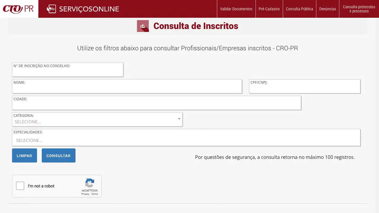 Consulta cadastral de profissionais inscritos no CRO/PR.