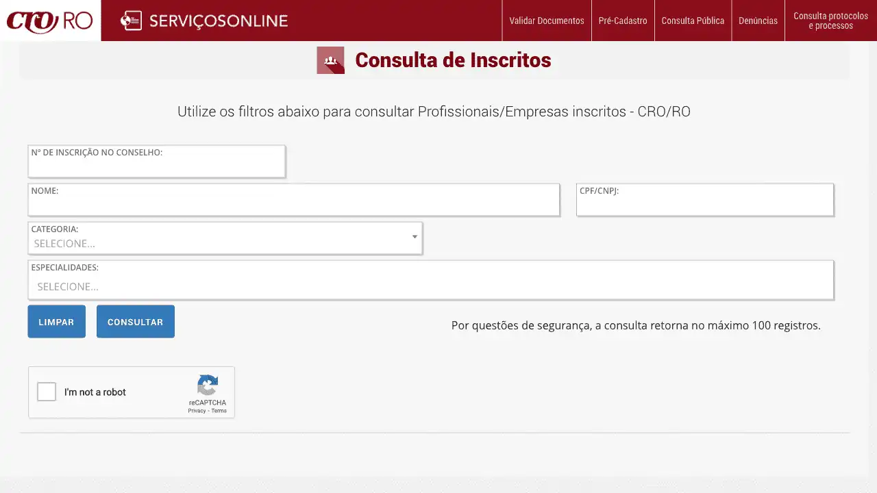 Consulta cadastral de profissionais inscritos no CRO/RO.