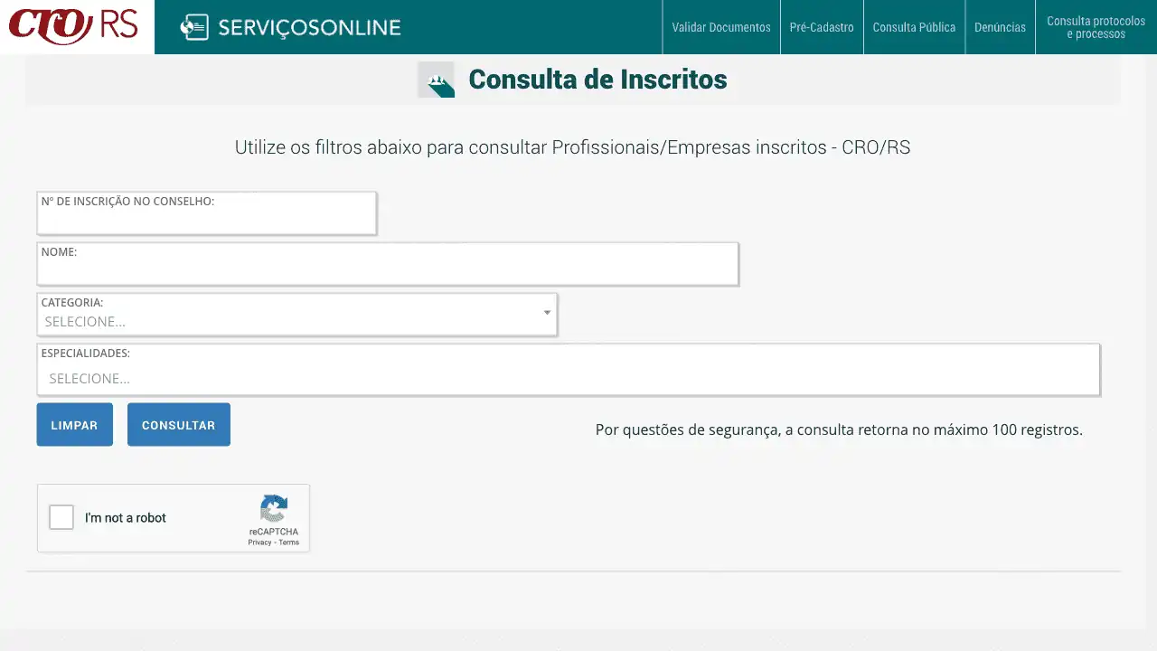 Consulta cadastral de profissionais inscritos no CRO/RS.