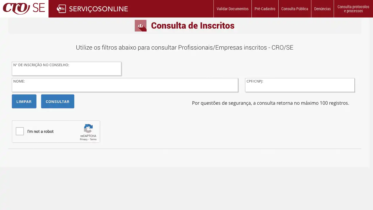Consulta cadastral de profissionais inscritos no CRO/SE.