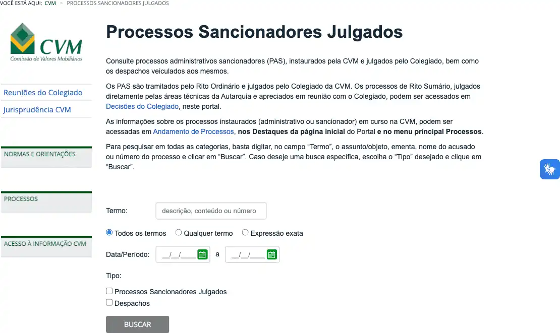 Consulta processos administrativos sancionadores (PAS) na Comissão de Valores Mobiliários (CVM).