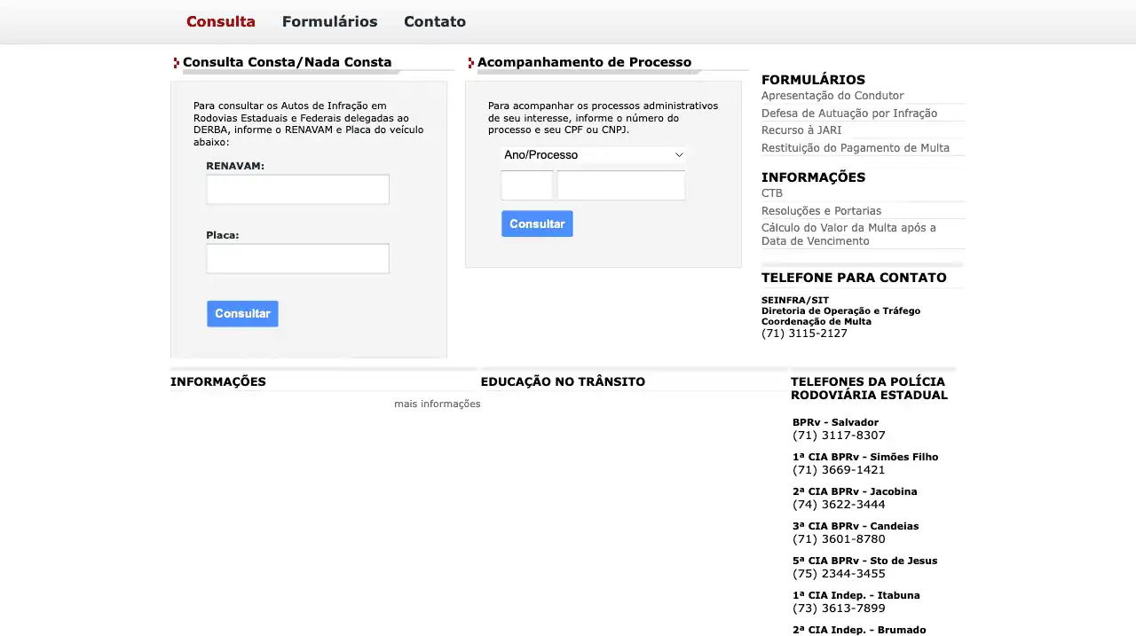 Consulta os Autos de Infração em Rodovias Estaduais e Federais delegadas ao DERBA, com o RENAVAM e Placa do veículo.