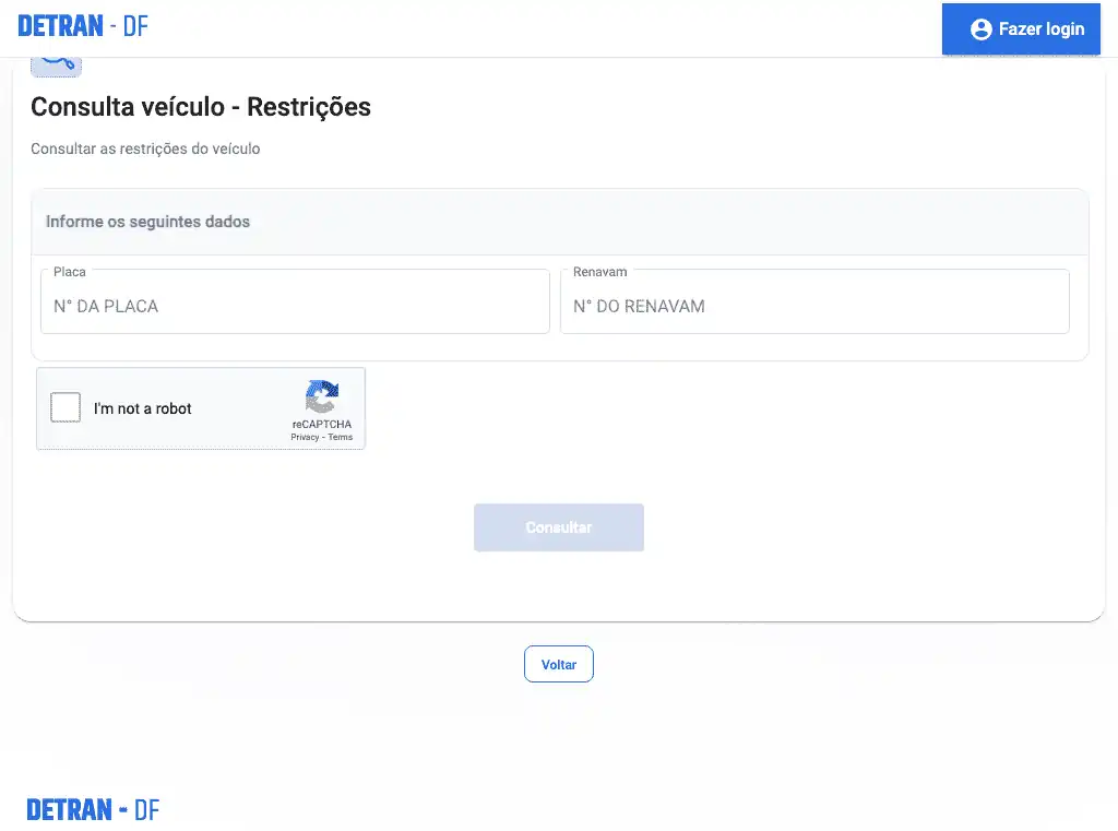 Consulta a existência de restrições em veículos do estado do Distrito Federal através da placa e renavam informados.