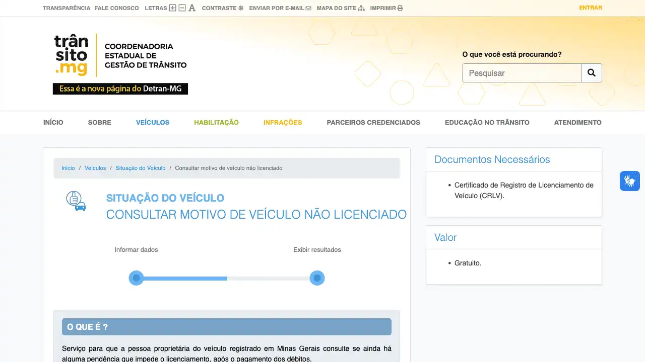 Consulta a situação de veículo não licenciado no Detran de Minas Gerais (MG), através da placa e número do chassi do veículo.