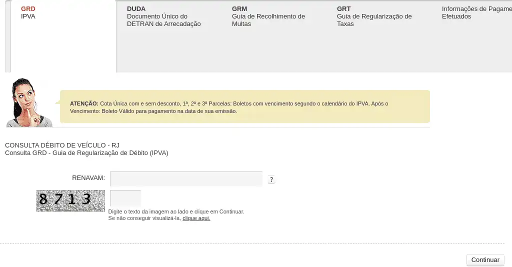 Consulta e emite GRD (Guia de Regularização de Débito) de um veículo no DETRAN do Rio de Janeiro (RJ), através do RENAVAM.