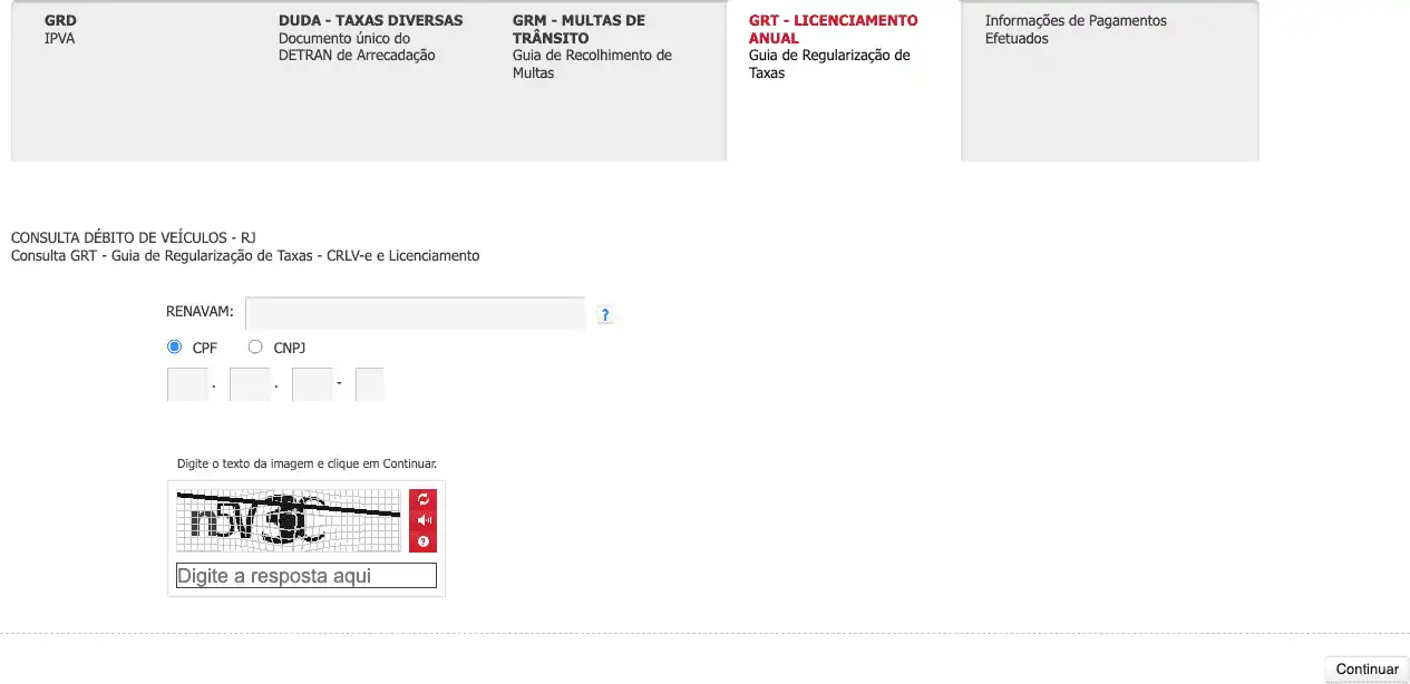 Consulta e emite GRT (Guia de Regularização de Taxas) de um veículo no DETRAN do Rio de Janeiro (RJ), através do RENAVAM.