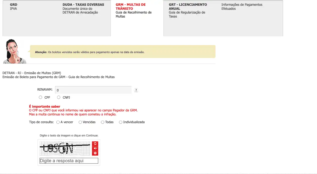 Consulta e emite GRM (Guia de Recolhimento de Multas) de um veículo no DETRAN do Rio de Janeiro (RJ), através da placa e número de renavam.