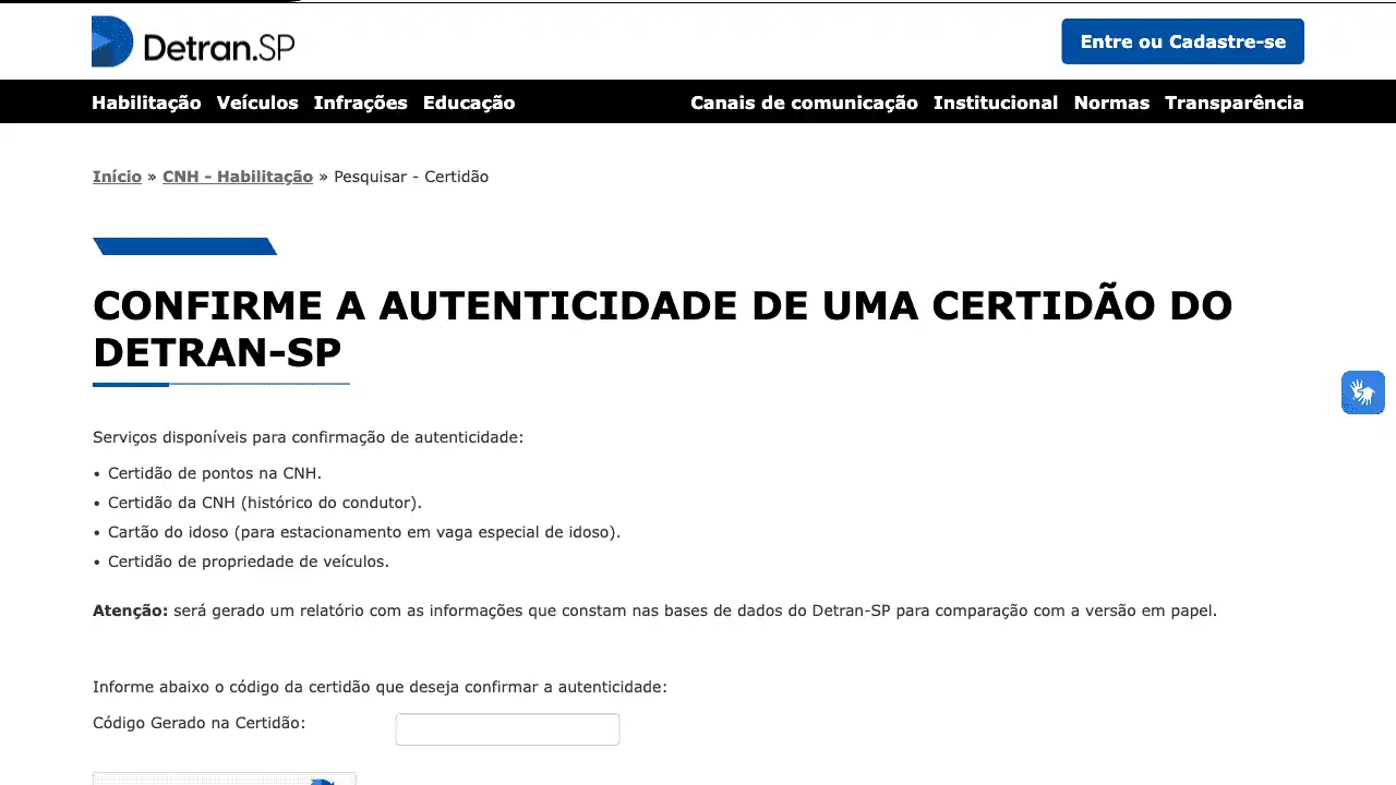 Pode ser usada para confirmar autenticidade de uma 'Certidão de pontos na CNH'.