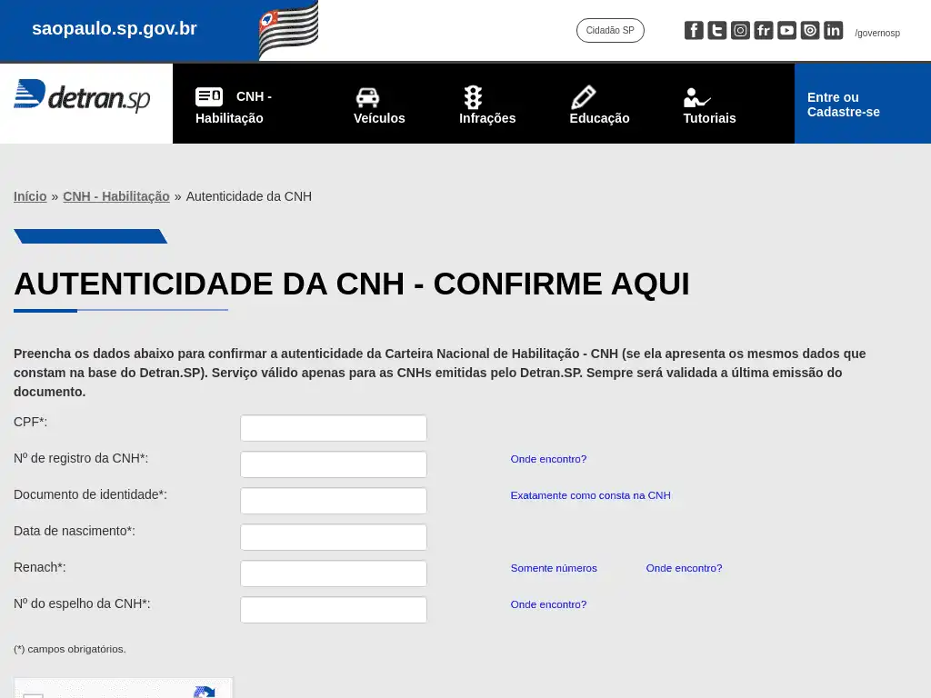 A consulta DETRAN / SP / CNH (Autenticidade) não está mais disponível desde que o site oficial deixou de disponibilizar esse serviço.