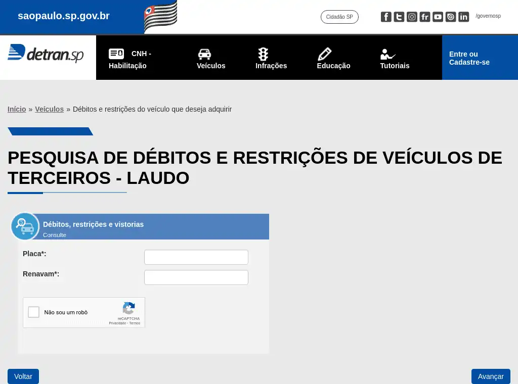 Consulta a existência de débitos, restrições e vistorias de veículos de terceiros do Estado de São Paulo através da placa e renavam informados.