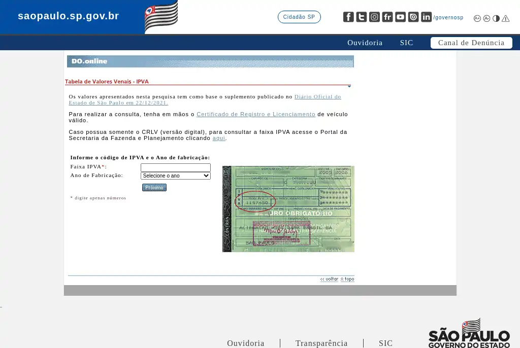 Consulta o Valor Venal de um veículo para o cálculo do IPVA de São Paulo.