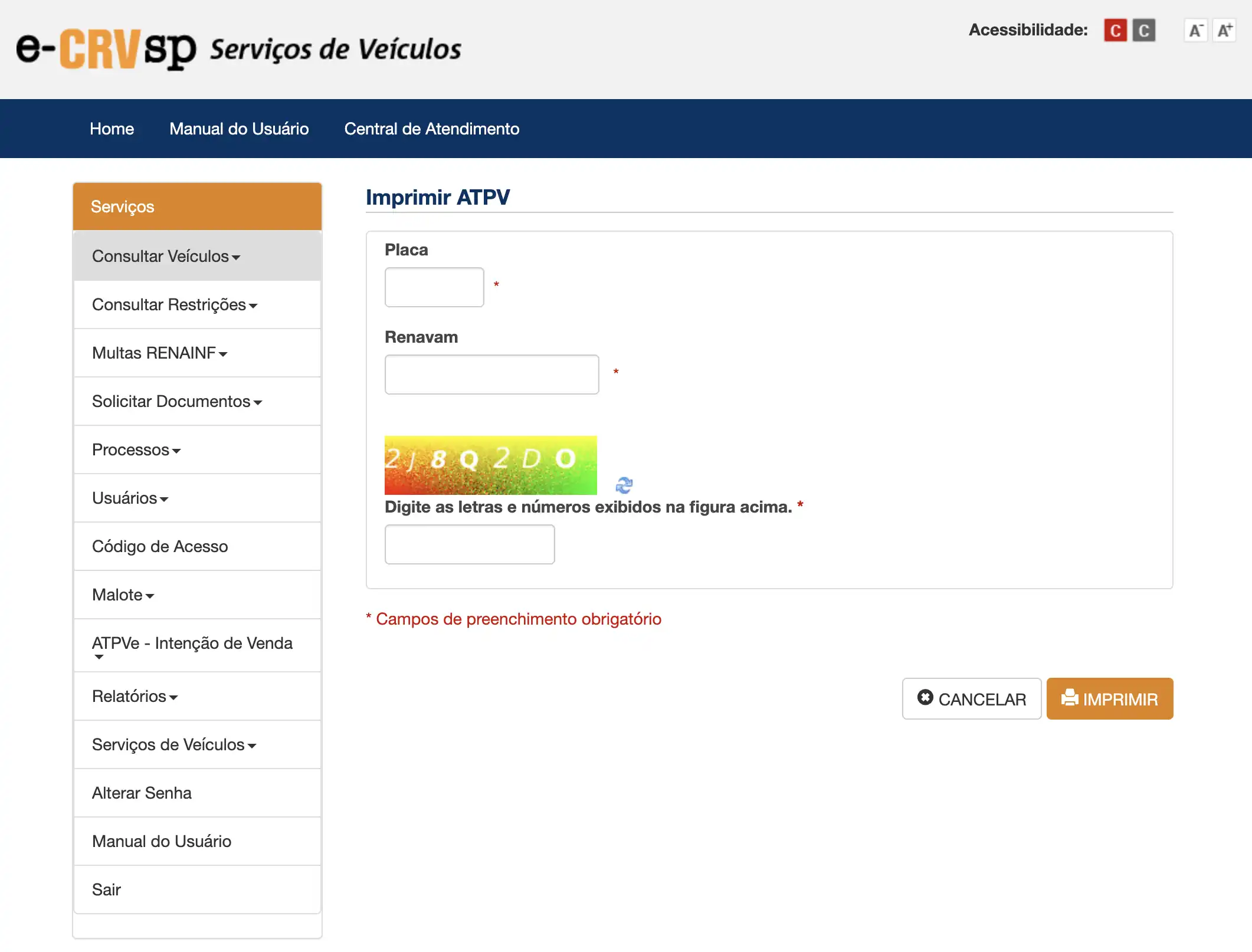 Emite o PDF do ATPVe de um veículo no portal e-CRVsp do DETRAN de São Paulo. A emissão é feita com a placa e o RENAVAM do veículo.