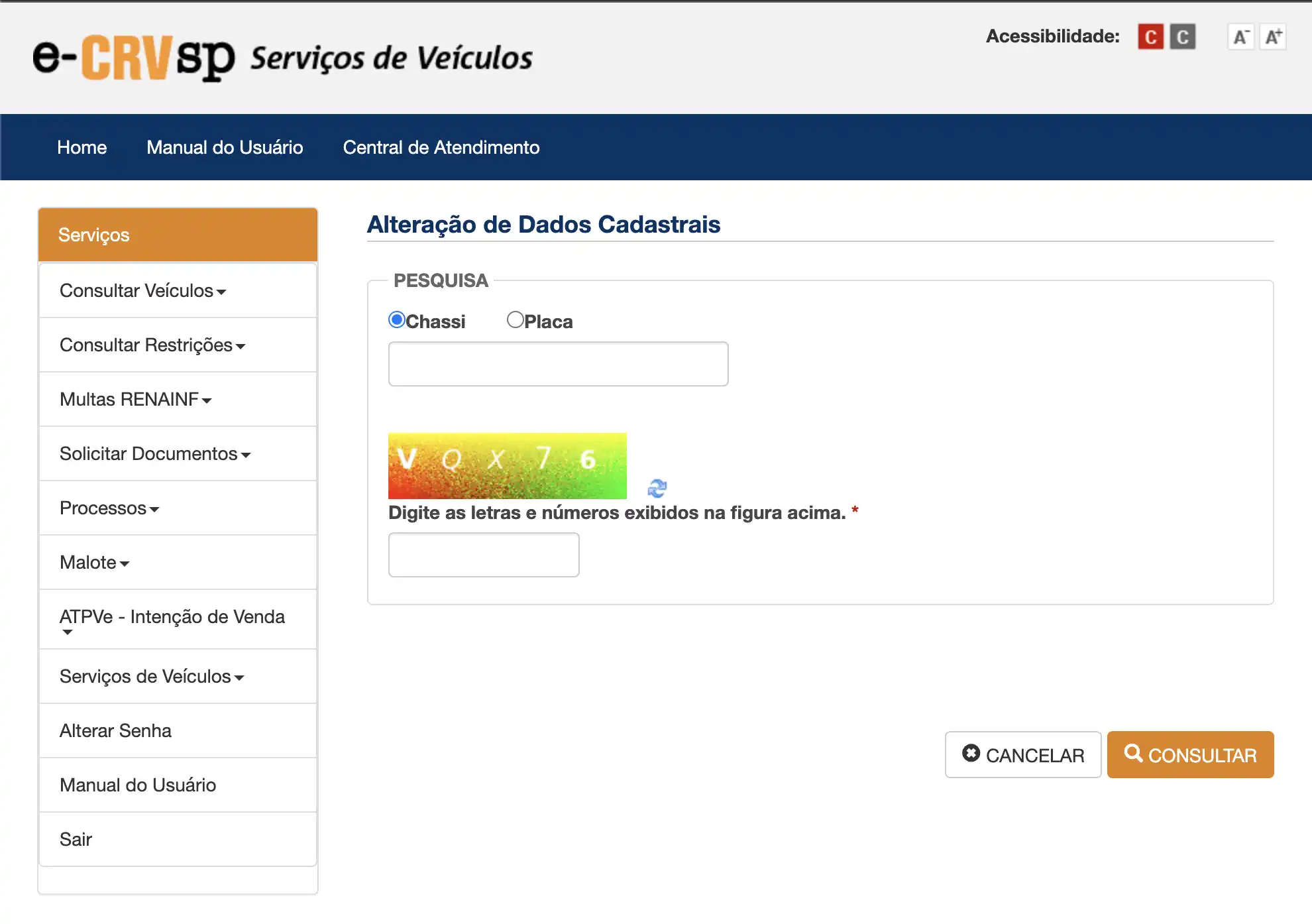 Inicia o preenchimento do formulário de Alteração de Dados Cadastrais de um veículo dentro do portal e-CRVsp do DETRAN de São Paulo.