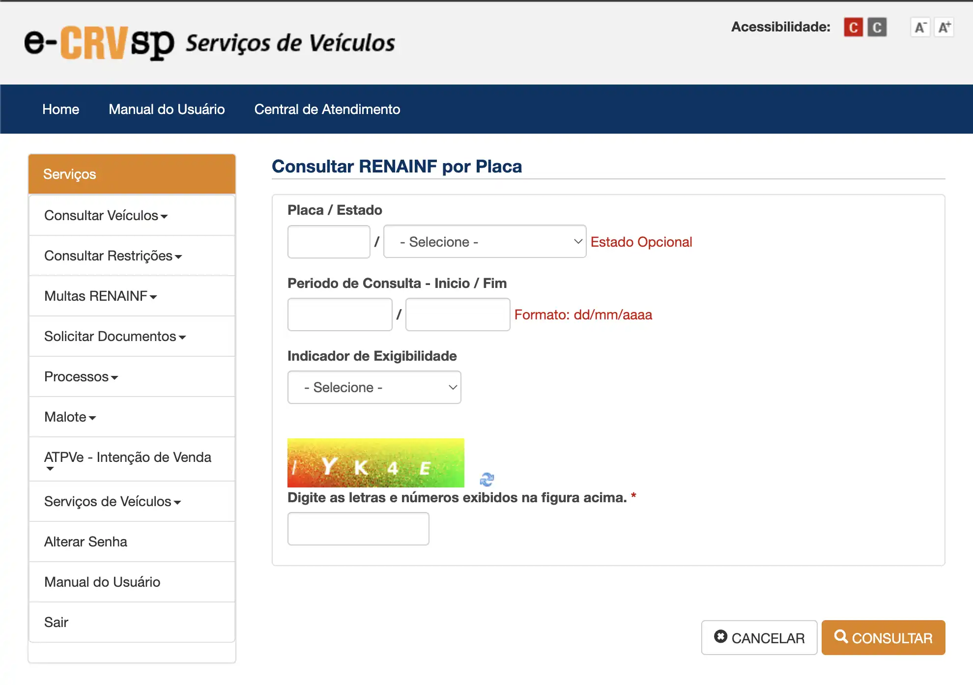 Consulta multas RENAINF na pesquisa por Placa dentro do portal e-CRVsp do DETRAN de São Paulo. A pesquisa é feita a partir da placa e das datas inicial e final das infrações.