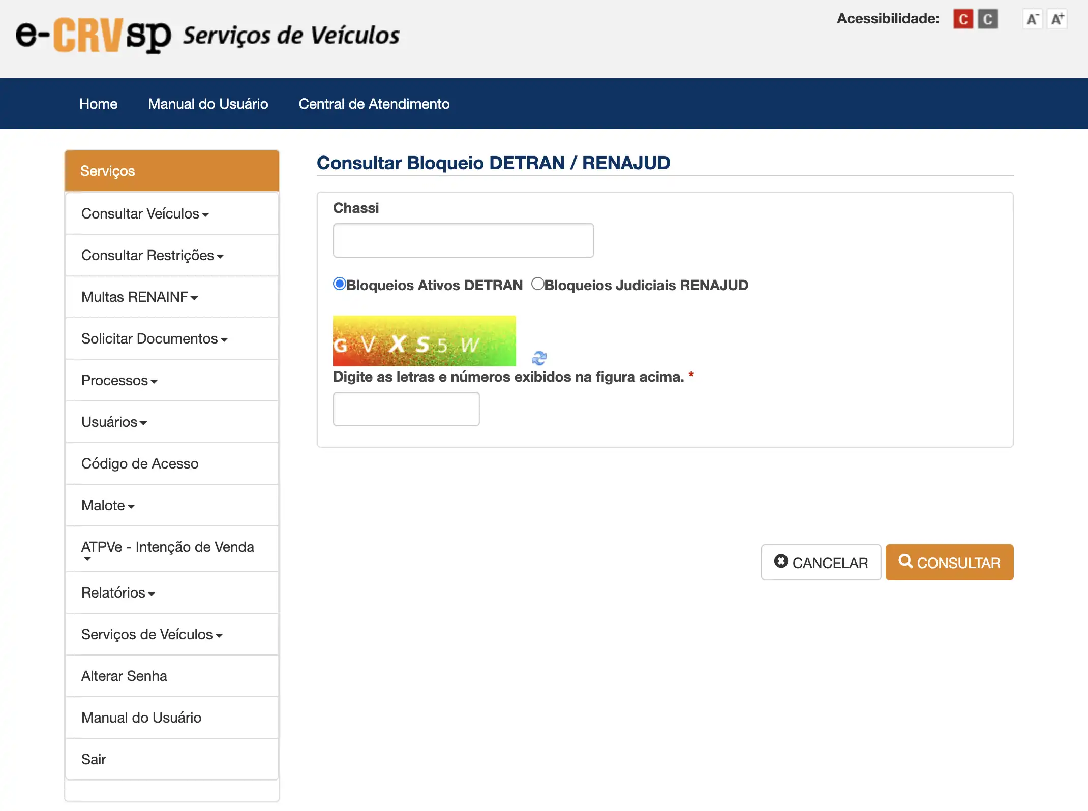 Consulta bloqueios ativos DETRAN de um veículo dentro do portal e-CRVsp do DETRAN de São Paulo. A pesquisa é feita a partir do chassi do veículo.