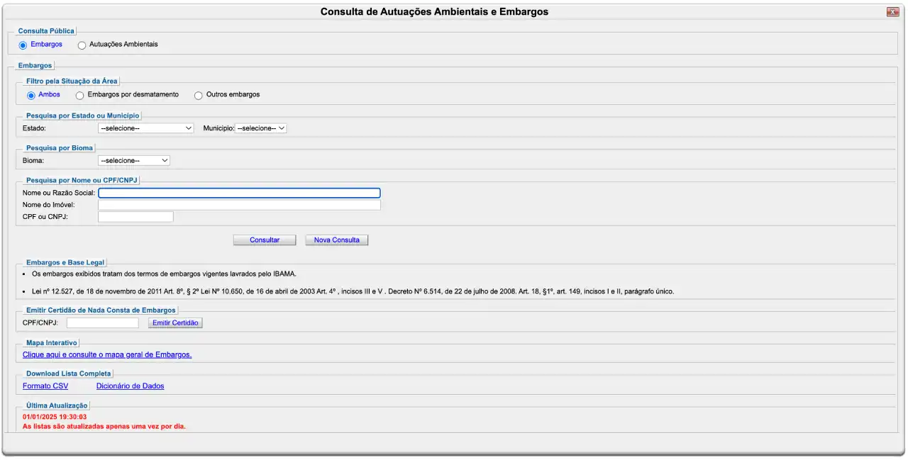 Pode ser usado em gestão de riscos de pessoas físicas ou jurídicas, verificando se uma pessoa possui embargos no IBAMA.