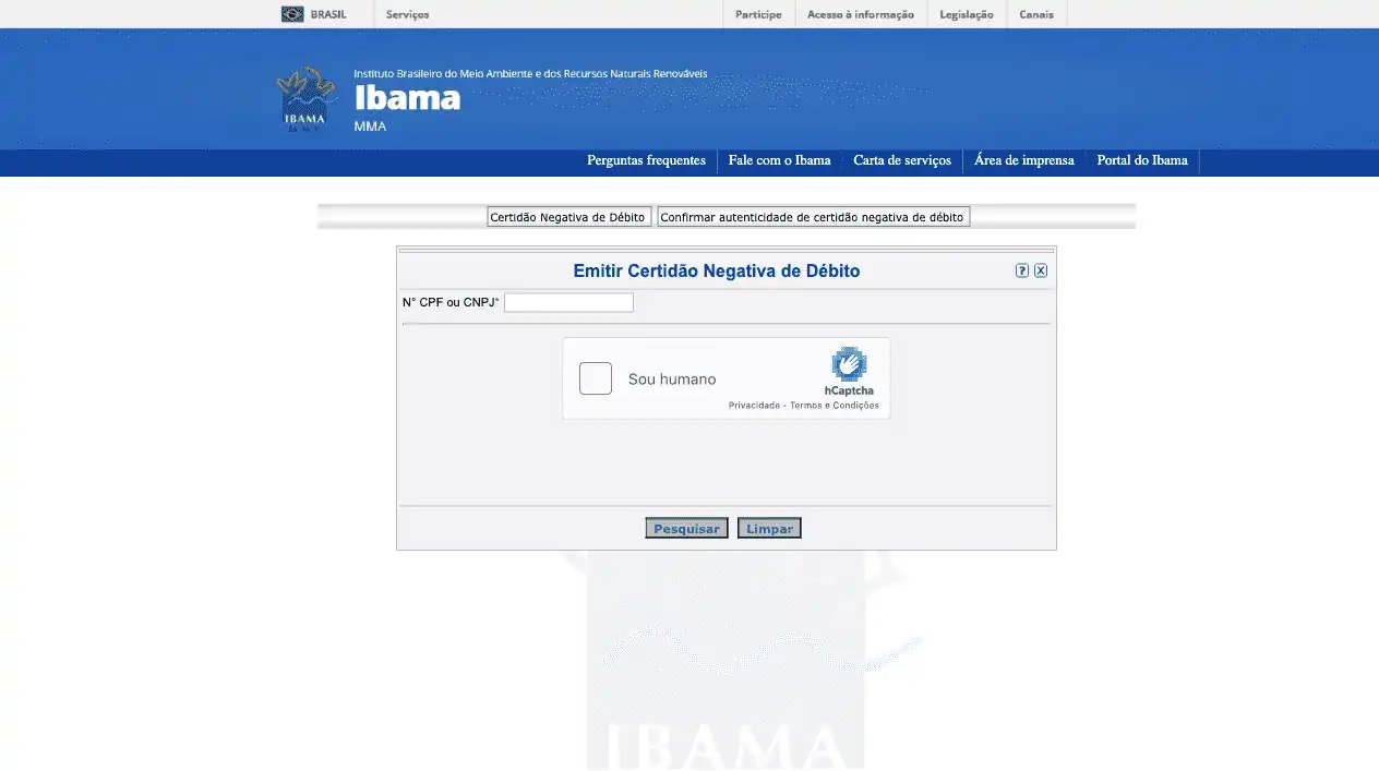 Emite a Certidão Negativa de Débitos no IBAMA emitida pelo Sistema de Cadastro, Arrecadação e Fiscalização (Sicafi), de uma pessoa física ou jurídica, através do CPF ou CNPJ.