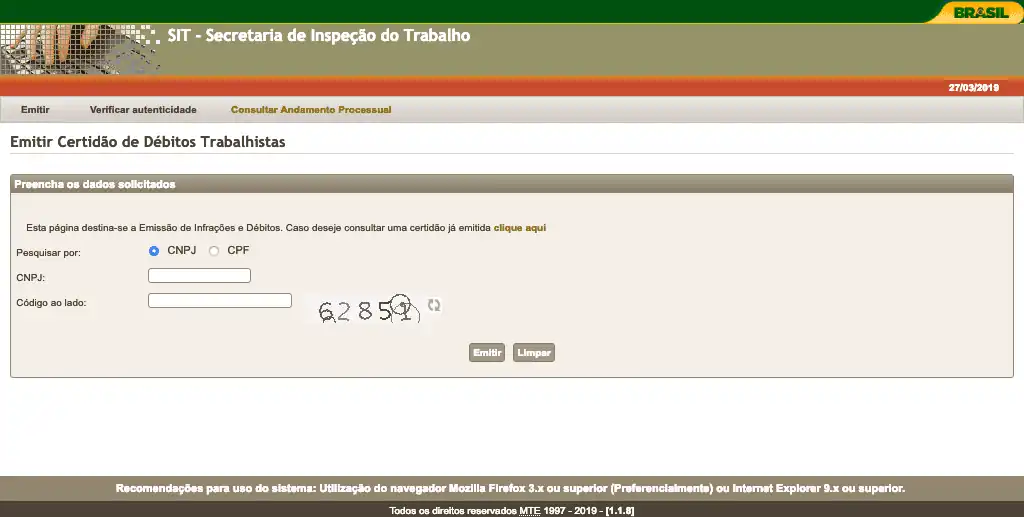 Consulta dados da Certidão de Débitos Trabalhistas na Secretaria de Trabalho do Ministério do Trabalho e Previdência através do número de CPF ou CNPJ.