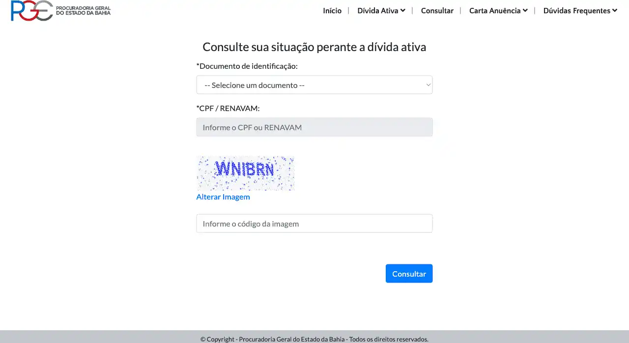 Consulta débitos de veículo na Procuradoria Geral (PGE) do Estado da Bahia (BA).