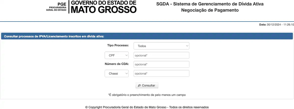 Consulta débitos de um veículo na Dívida Ativa da Procuradoria Geral (PGE) do Estado do Mato Grosso (MT).