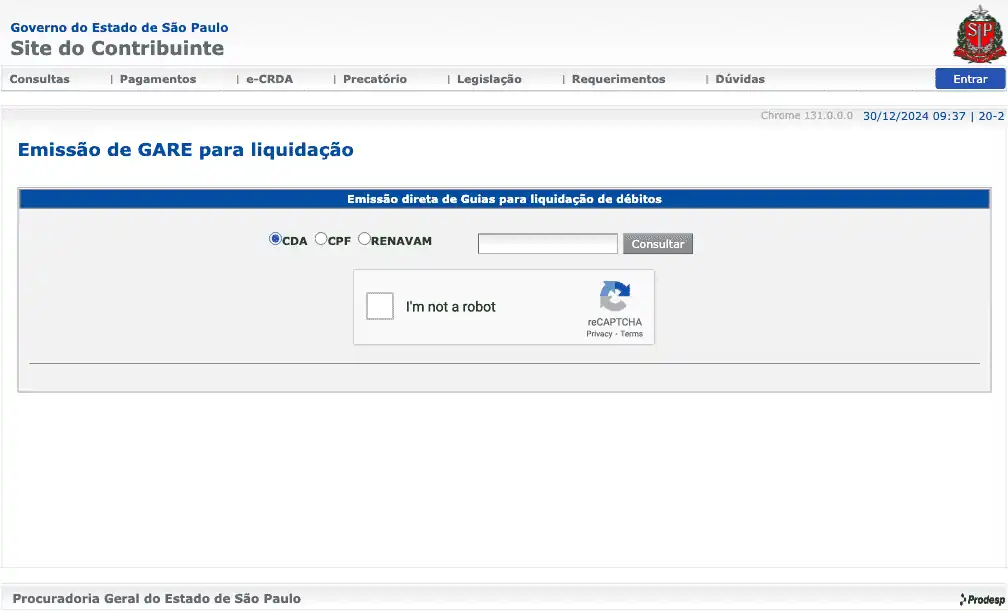 Emite o GARE de liquidação de um determinado CDA, CPF ou RENAVAM o Estado de São Paulo.