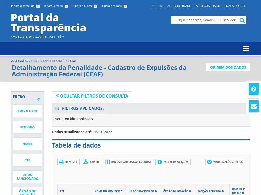 Consulta sanções no Portal da Transparência do tipo Cadastro de Expulsões da Administração Federal (CEAF), que reúne as penalidades expulsivas (demissão, cassação de aposentadoria e destituição de cargo em comissão ou função comissionada) aplicadas no âmbito do Poder Executivo Federal e da Câmara dos Deputados, a servidores civis, efetivos ou não.