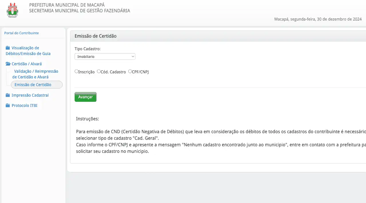 Emite certidão negativa de débitos no âmbito da prefeitura municipal de Macapá do estado do Amapá.
