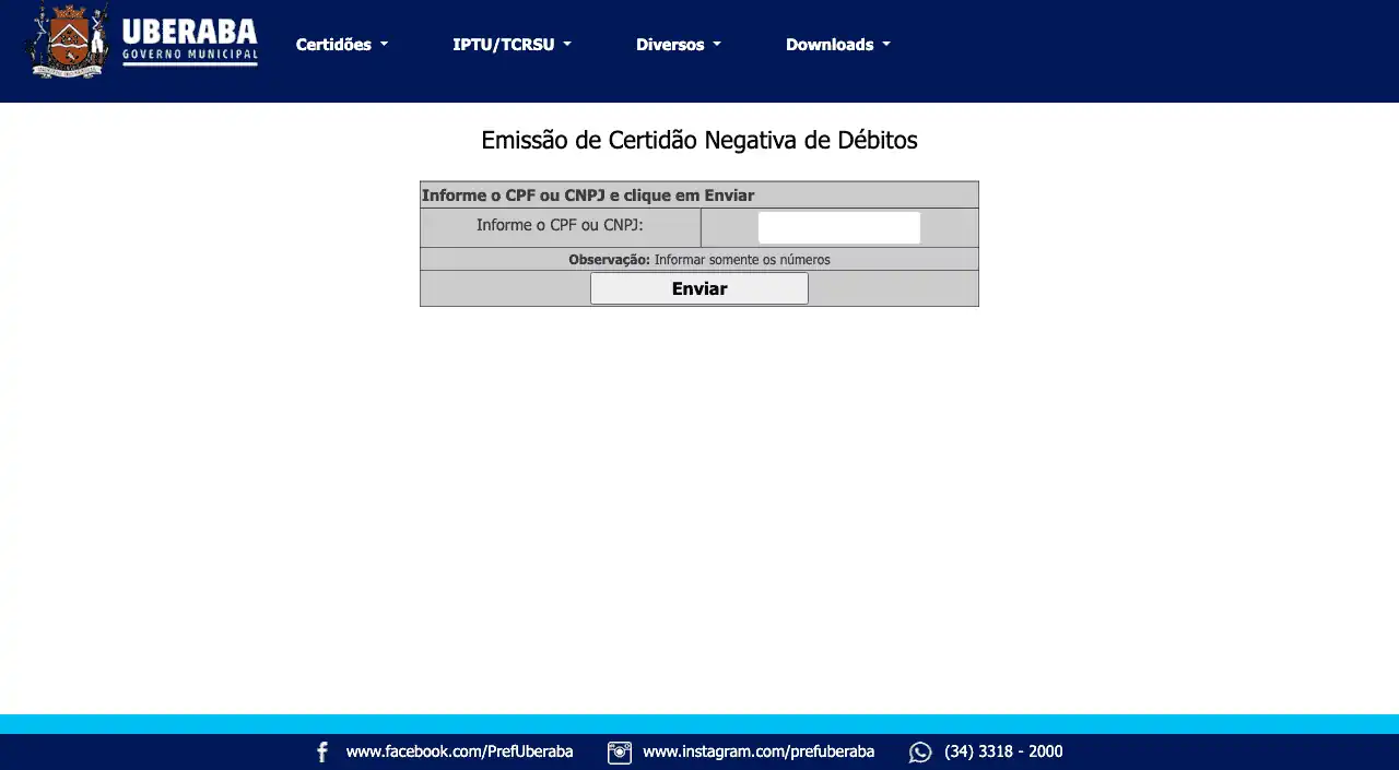 Emite certidão negativa de débitos no âmbito da prefeitura municipal de Uberaba do estado de Minas Gerais.