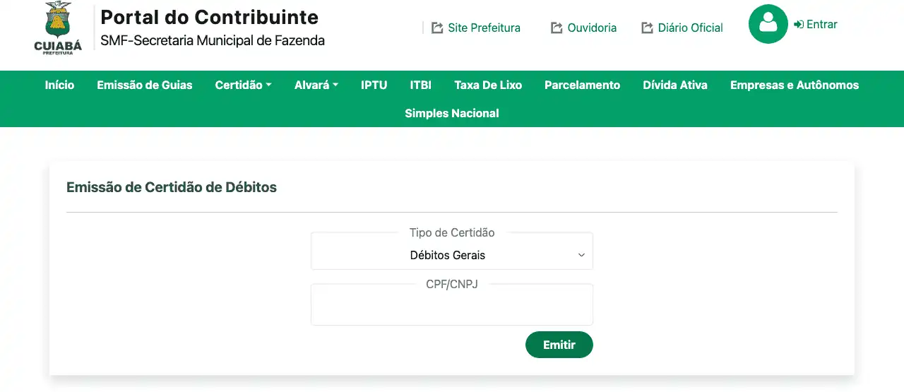 Emite uma Certidão Negativa de Débitos no município de Cuiabá - MT, por meio do CPF/CNPJ informado.