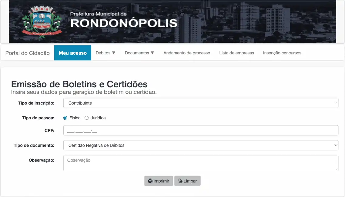 Emite uma Certidão Negativa de Débitos no âmbito da prefeitura municipal de Rondonópolis do estado do Mato Grosso (MT).