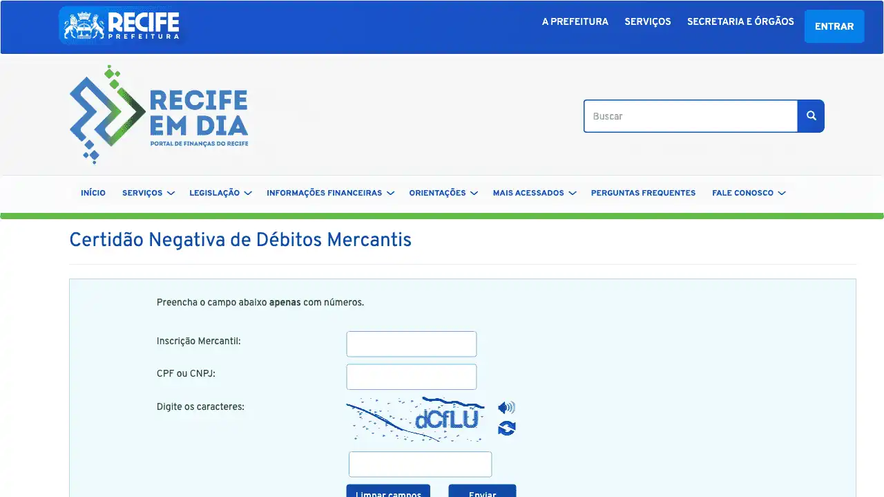 Emite uma Certidão Negativa de Débitos no município de Recife - PE, por meio do CPF/CNPJ e Inscrição informados.