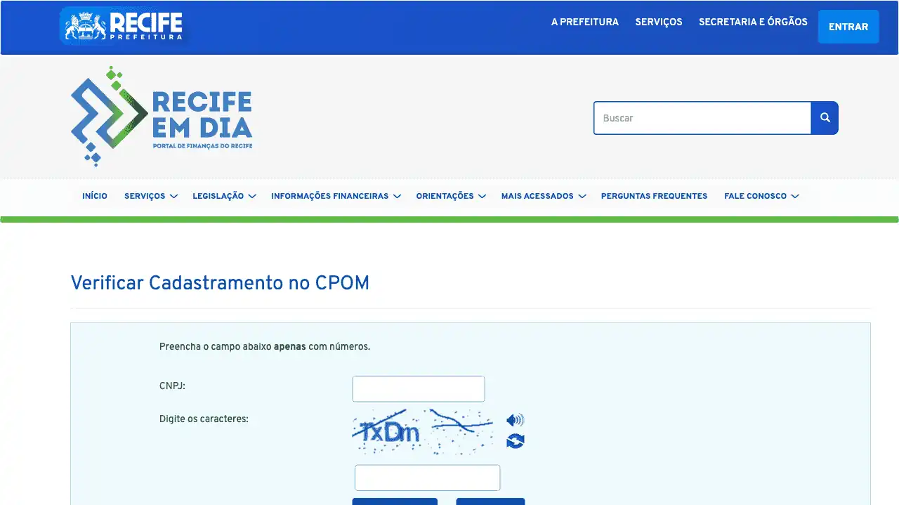 Consulta se um CNPJ está inscrito no Cadastro de Prestadores de Outros Municípios (CPOM) da Prefeitura de Recife do Estado de Pernambuco.