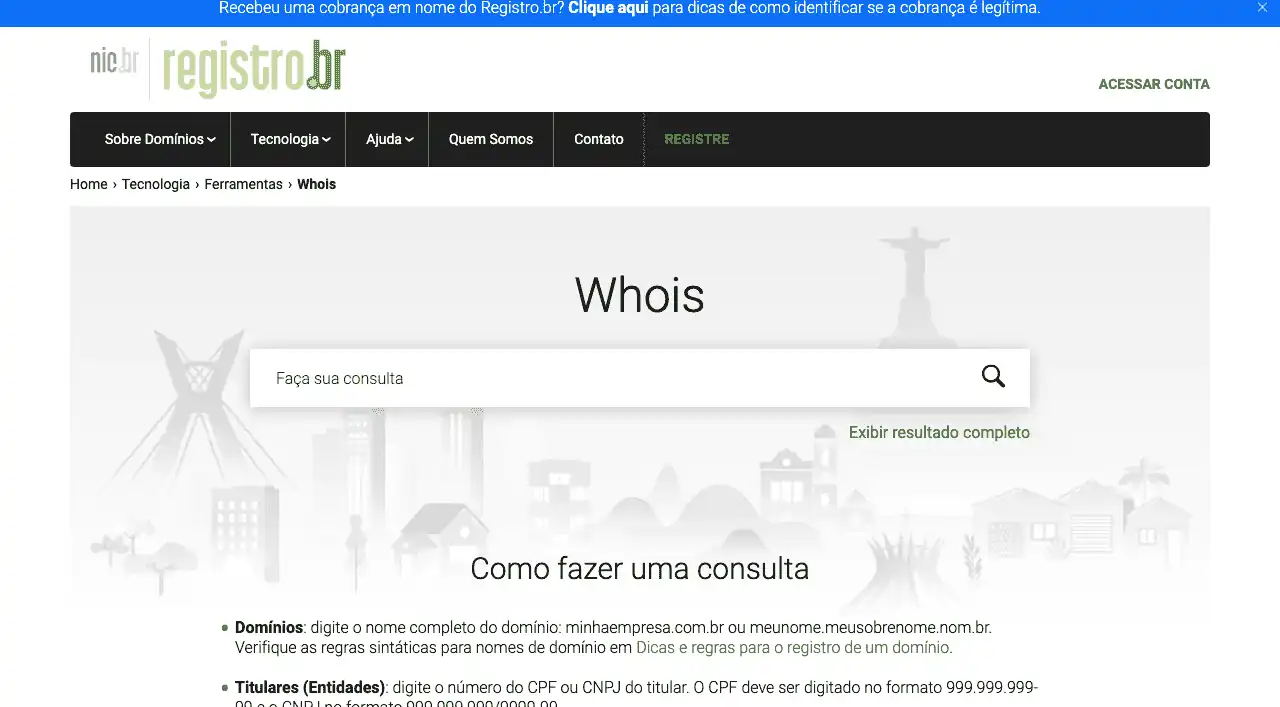 A consulta Registro BR / Whois não está mais disponível desde que o site oficial foi reformulado.