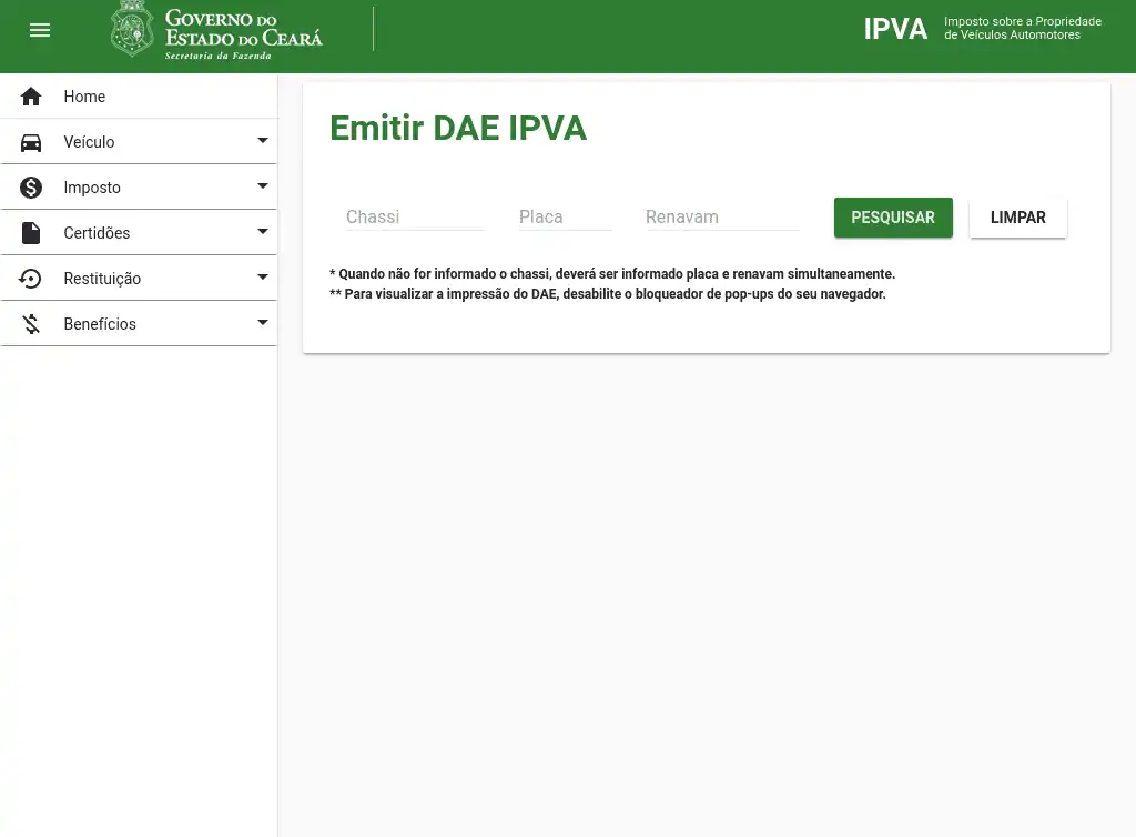 Pesquisa dados de Imposto sobre Propriedades de Veículos Automotores (IPVA), através do número de renavam e placa ou chassi, para o Estado do Ceará (CE).