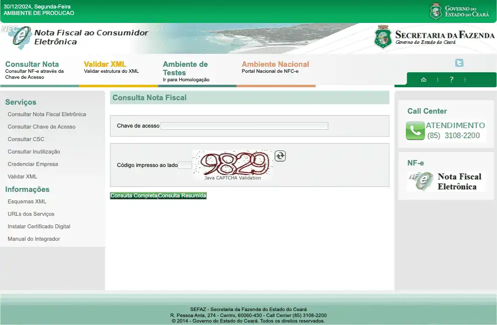 Consulta Nota Fiscal de Consumidor Eletrônica (NFC-e) na Secretaria da Fazenda (SEFAZ) do Estado do Ceará (CE).