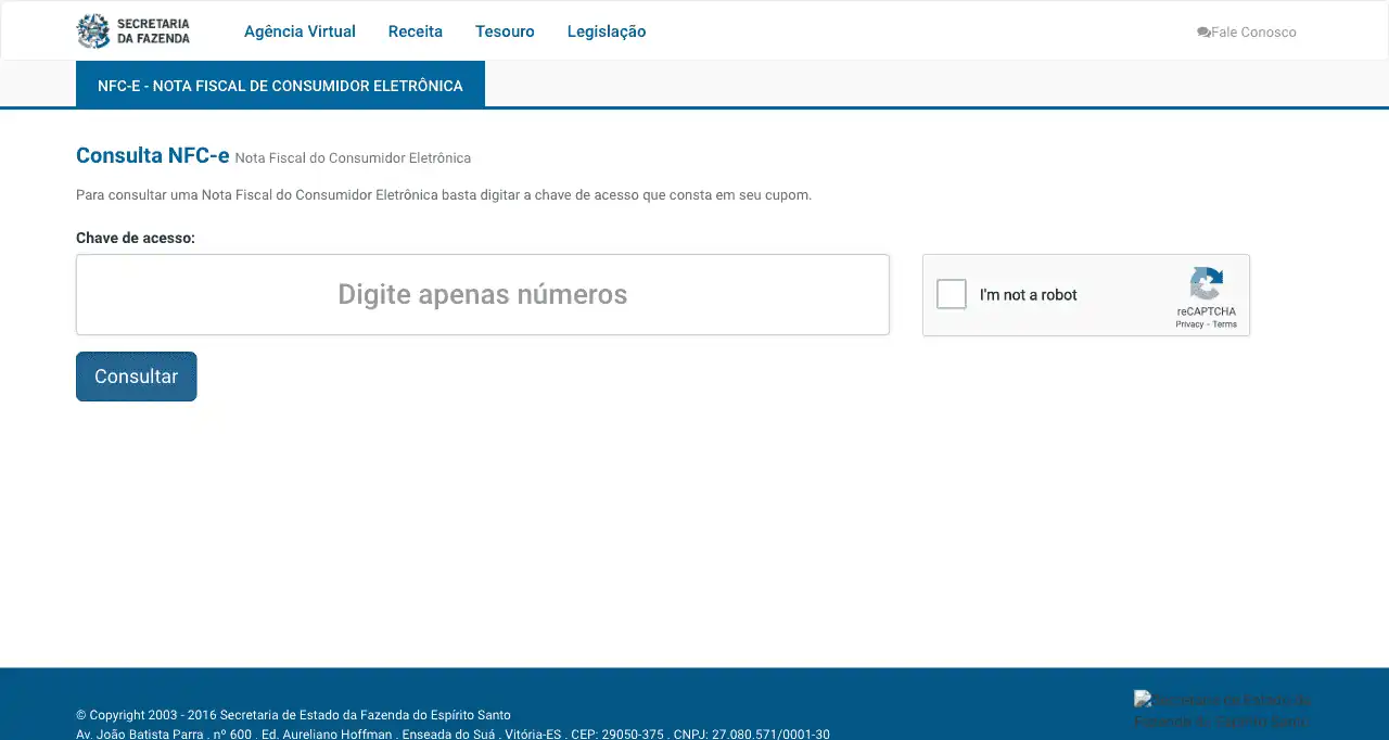 Consulta Nota Fiscal de Consumidor Eletrônica (NFC-e) na Secretaria da Fazenda (SEFAZ) do Estado do Espirito Santo (ES).