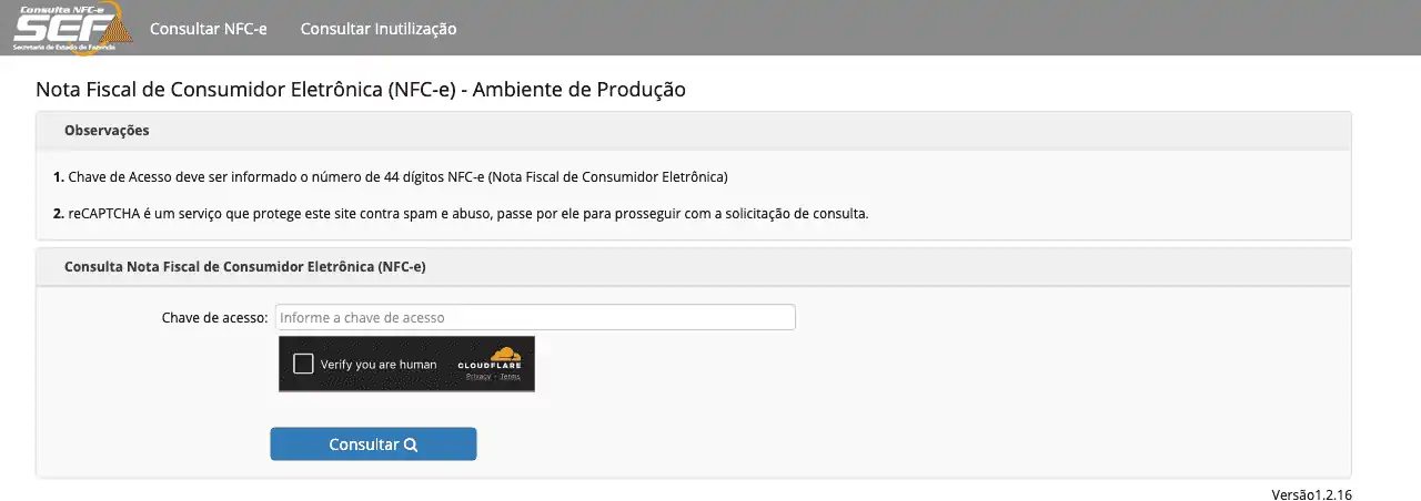 Consulta Nota Fiscal de Consumidor Eletrônica (NFC-e) na Secretaria da Fazenda (SEFAZ) do Estado de Minas Gerais (MG).