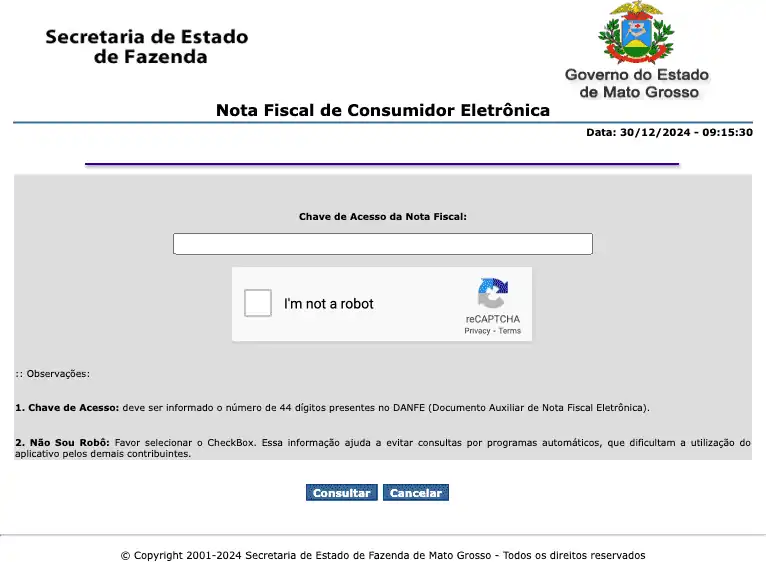 Consulta Nota Fiscal de Consumidor Eletrônica (NFC-e) na Secretaria da Fazenda (SEFAZ) do Estado de Mato Grosso (MT).