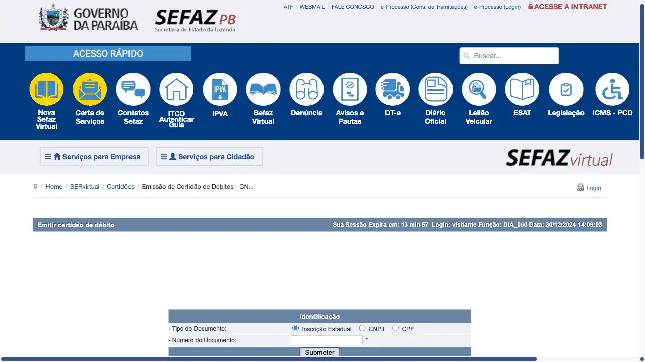 Emite Certidão Negativa de Débitos na SEFAZ PB.